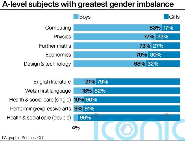 Physics (77% boys, 23% girls) and further maths (73% boys, 27% girls) were among the other subjects skewed heavily towards males.
