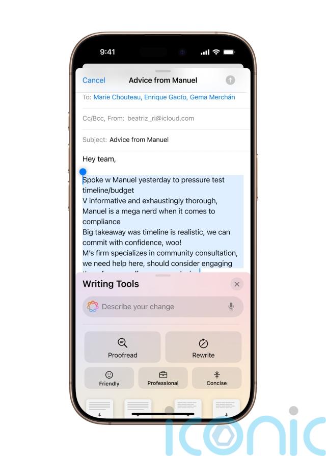 The AI-powered tools use “personal context” to provide help, Apple said, for example offering edits to writing or notes made in almost any app, or being able to quickly find a specific photo or moment within a video based on a typed description.