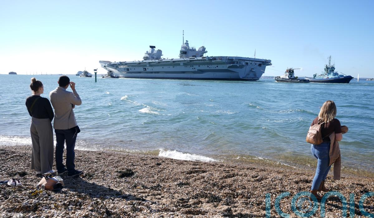 A 65,000-tonne British warship which carries fighter jets has left Portsmouth ahead of major exercises in the North Sea.