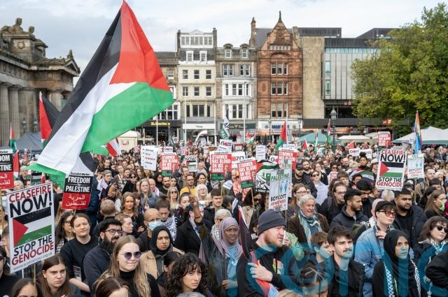 The gathering came after tens of thousands of pro-Palestinian demonstrators marched through London and Edinburgh on Saturday.