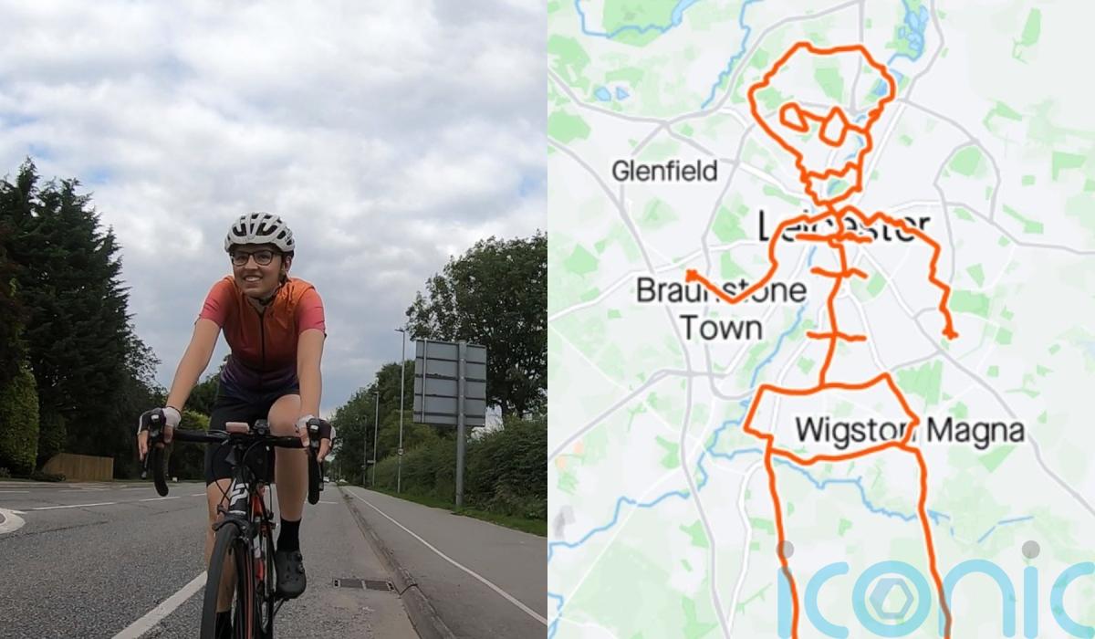 Rebecca Laurel, 25, from Leicester, cycled for more than six hours across the city centre on Sunday to create a cycle path shaped like a skeleton.