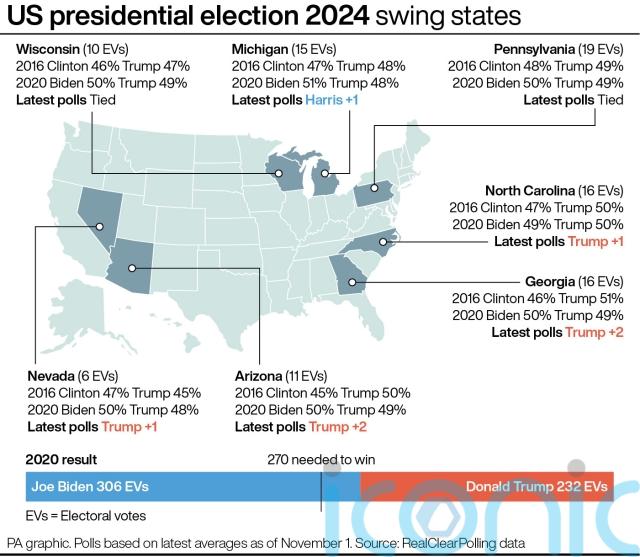 Seven states are considered so-called swing states in this year’s election, with Nevada, Arizona, Michigan and Wisconsin also among them.
