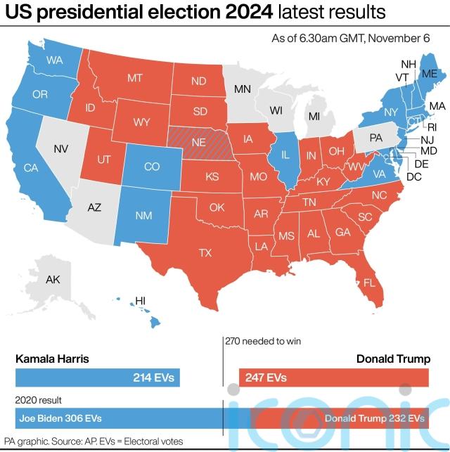 If the voting results follow predictions by the Associated Press, Mr Trump will have gained 247 votes in the electoral college, and Ms Harris 214 with the current states which have been called.