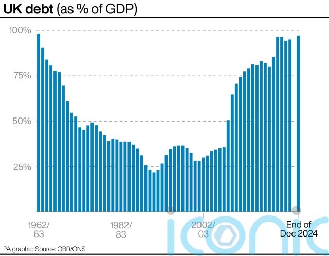 The latest borrowing figures estimated that public sector net debt, excluding taxpayer-backed banks, reached 97.2% of gross domestic product (GDP) at the end of last year; up from 96.9% a year earlier and staying at levels last seen in the early 1960s.
