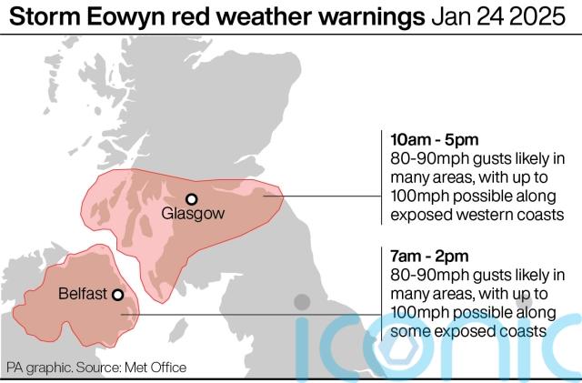 The Met Office red warning runs from 10am to 5pm and covers the central belt including Glasgow and Edinburgh, stretching north on the west coast to Jura in Argyll and Bute and south to Stranraer in Dumfries and Galloway.