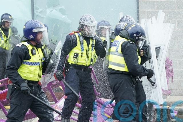 Demonstrators gather in Whitehall, London, for an “Enough Is Enough” protest. Flares and cans are thrown at police and more than 100 people are arrested. Disorder also breaks out in Hartlepool, County Durham, and Aldershot, Hampshire.