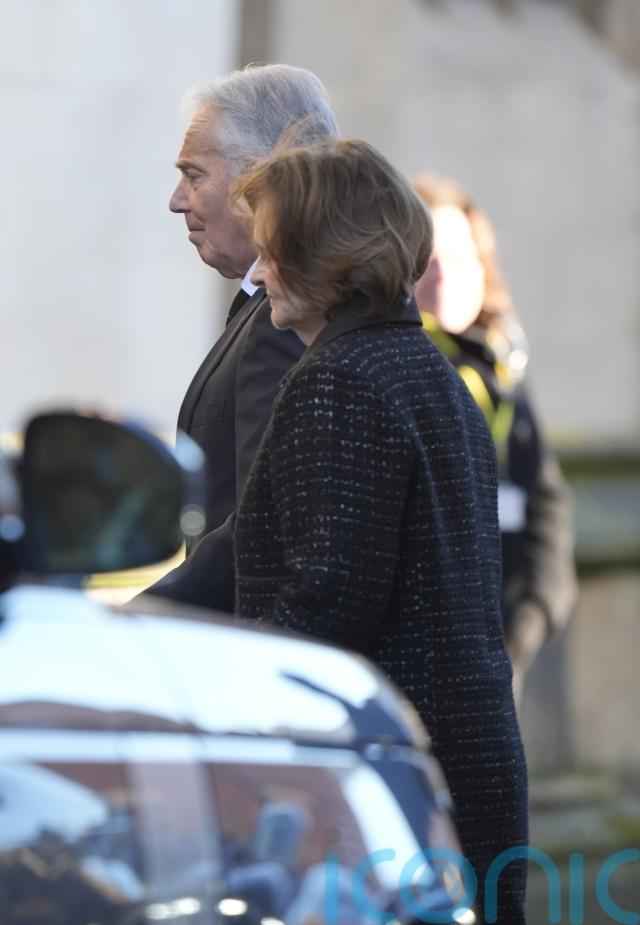 Former prime minister Sir Tony Blair arrived with his wife Cherie and was followed into the church by Lord Mandelson.