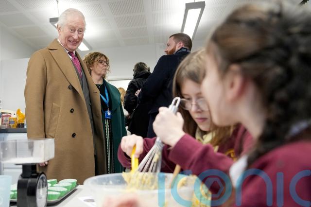 Students showed the King how they were making vanilla cupcakes and Charles asked about the ingredients they were using.