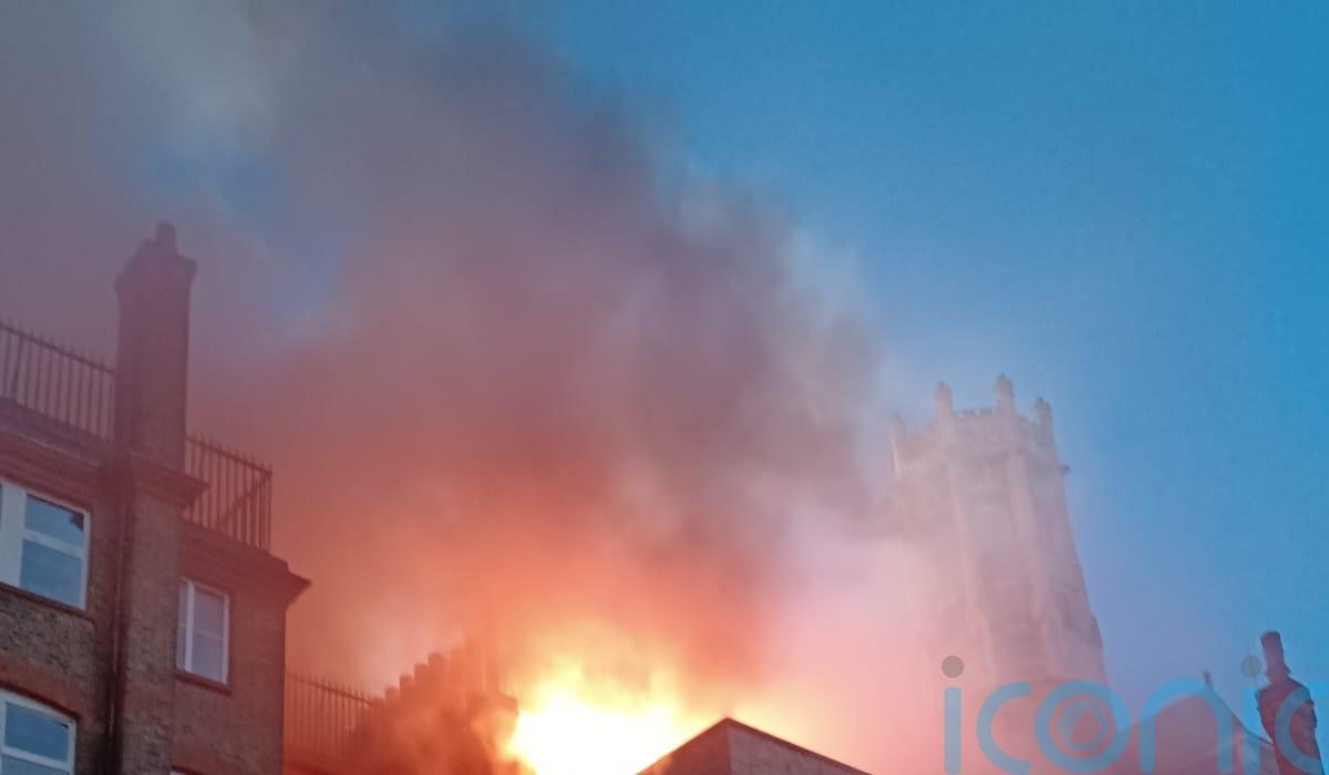 Videos on social media show flames which are engulfing the top of the building being doused by fire officers from a crane, while smoke billows out of the roof.