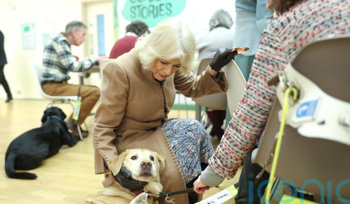 Camilla toured the building, meeting various local groups, and when she saw Fergie, a golden retriever guide dog whose partially-sighted owner Susan Mason was taking part in a “sensing culture” class, she could not resist giving the canine’s belly a rub.