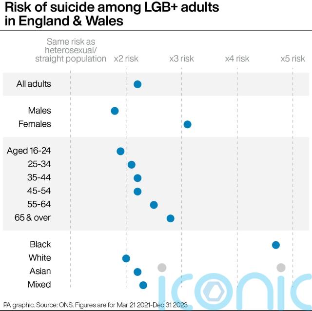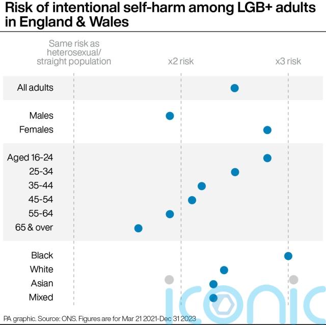 The ONS found the risk of suicide for people aged 16 and over identifying as LGB+ was estimated to be 2.2 times higher than for those identifying as straight or heterosexual, while the risk of intentional self-harm was 2.5 times higher.