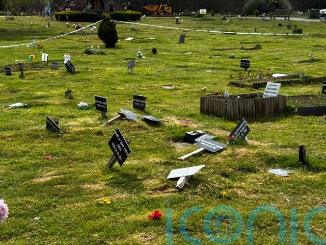 Hertfordshire Police said 85 grave plaques, including a large number thought to be for babies and children, were vandalised at Carpenders Park Lawn Cemetery, near Watford, Hertfordshire, after it was made aware of the incident on Sunday.