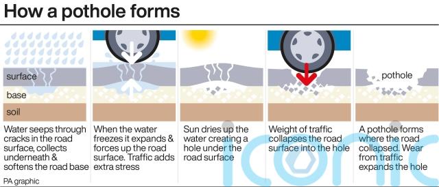 Common vehicle problems caused by potholes include damaged shock absorbers, broken suspension springs and distorted wheels.