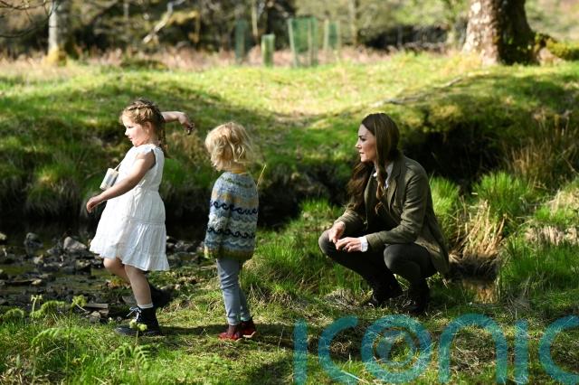 Kate crouched down to speak to some of the children learning about their environment through simple tasks like gathering flowers and den building, and she later played with the youngsters by the neighbouring River Lussa, as they threw sticks into the clear running water.