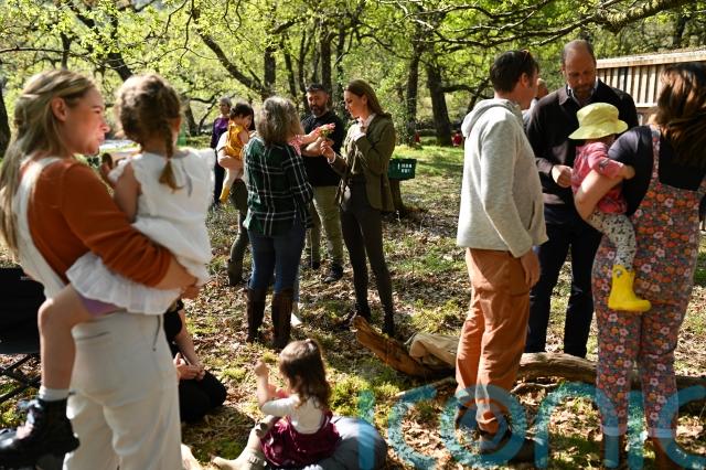 The Prince of Wales has spoken about the importance of communities as he joined his wife in an ancient woodland to meet youngsters learning about nature.