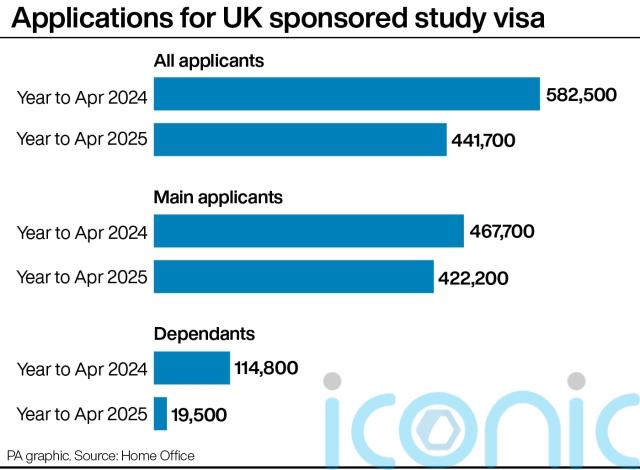 Separate figures, released by the Home Office on Thursday, showed that study visa applications were down 24% in the year to April 2025 compared with the previous 12 months, from 582,500 to 441,700.