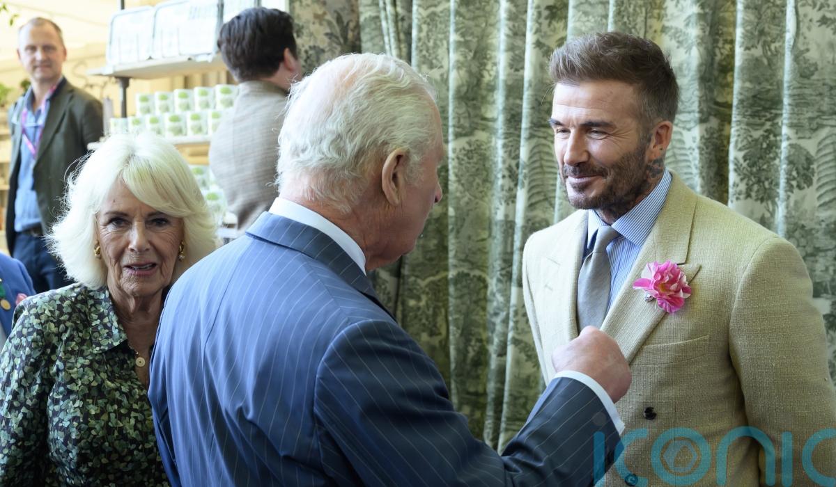 Beckham wore a King’s Rose in his button hole, a new bloom bred by rose producer David Austin in support of the King’s Foundation, when he met the King and his wife outside Charles’ Highgrove pop-up shop with fellow foundation ambassador Alan Titchmarsh.