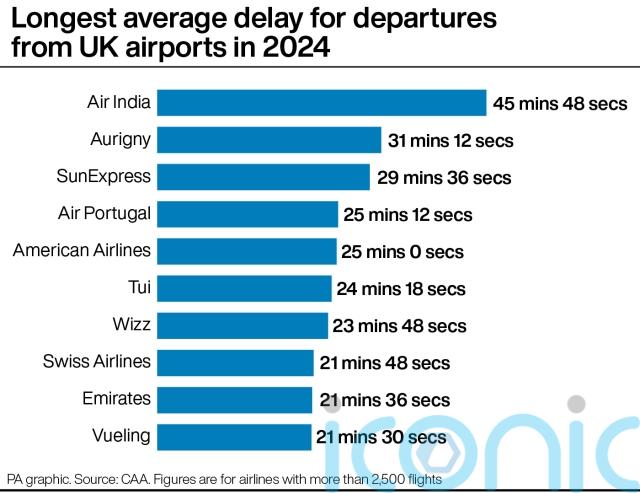 The carrier’s departures from UK airports were an average of 45 minutes and 48 seconds behind schedule in 2024, according to analysis of Civil Aviation Authority (CAA) data by the PA news agency.