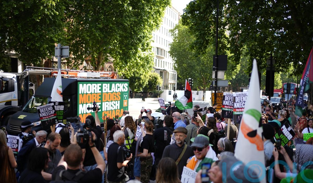 A mixture of Palestinian and Kneecap flags were being held by some of the crowd, and cheers were heard after an ad van drove past displaying the slogan “More Blacks, More Dogs, More Irish, Mo Chara”.