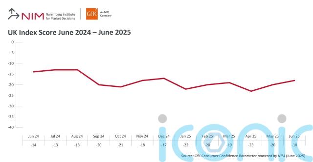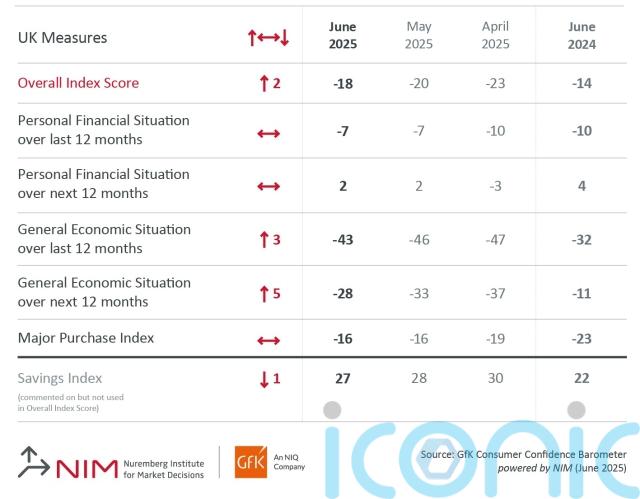 GfK’s long-running Consumer Confidence Index rose two points but remains firmly in negative territory at minus 18.