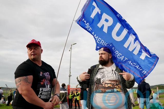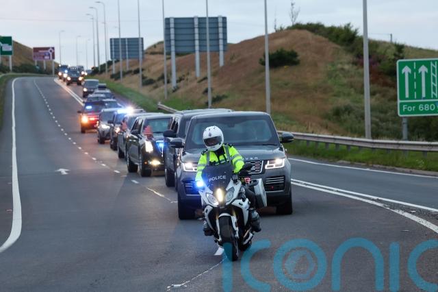 The president’s motorcade – which contained more than two dozen vehicles – passed a small group of protesters as he entered his Turnberry golf club.