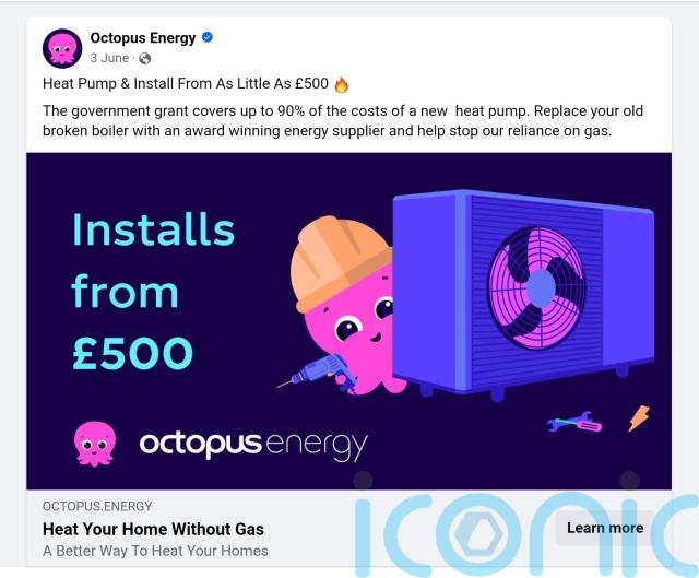 The Facebook ad, seen in September, said “Installs from £500” and continued: “The government grant covers up to 90% of the costs of a new heat pump. Replace your old broken boiler with an award-winning energy supplier and help stop our reliance on gas.”
