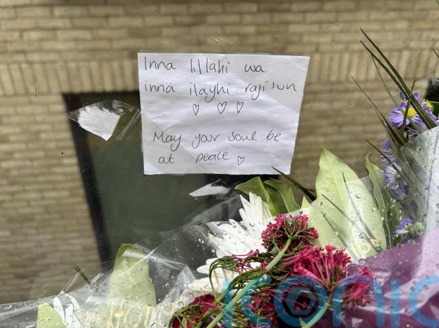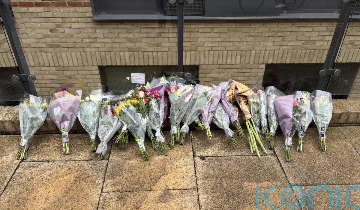 Floral tributes have been left on the pavement outside an apartment block in the street.
