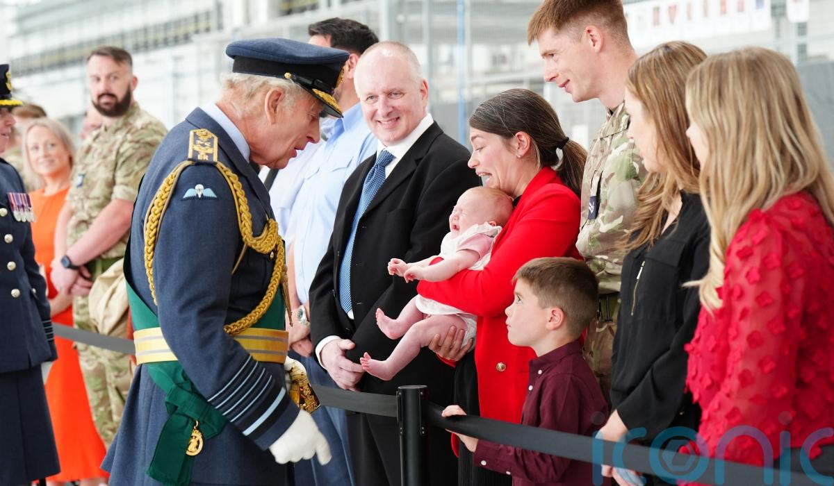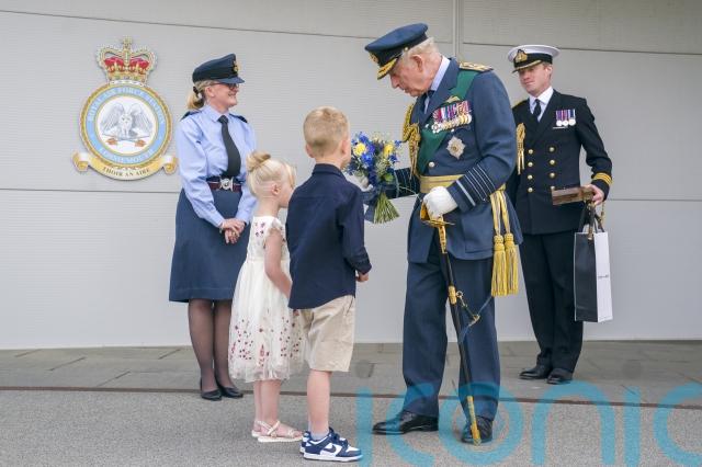 Bagpipers greeted Charles as he arrived by helicopter for a private meeting with RAF leaders, and he watched a parade and re-presented a squadron standard which had previously been blessed by a vicar who prayed for the military and their families as well as the monarch.