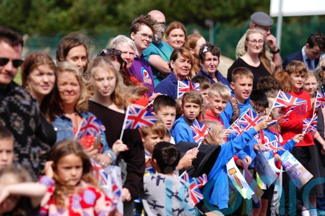 Schoolchildren waved Union flags as they met the King before he left in a BMW.