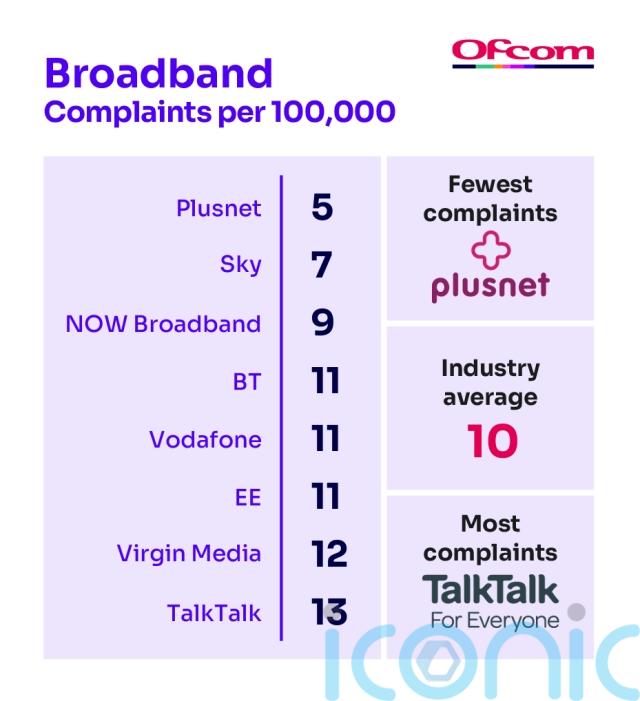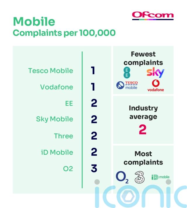 Plusnet generated the fewest complaints among broadband providers, while EE, Sky Mobile, Tesco Mobile and Vodafone were the least complained-about mobile providers, the regulator said.