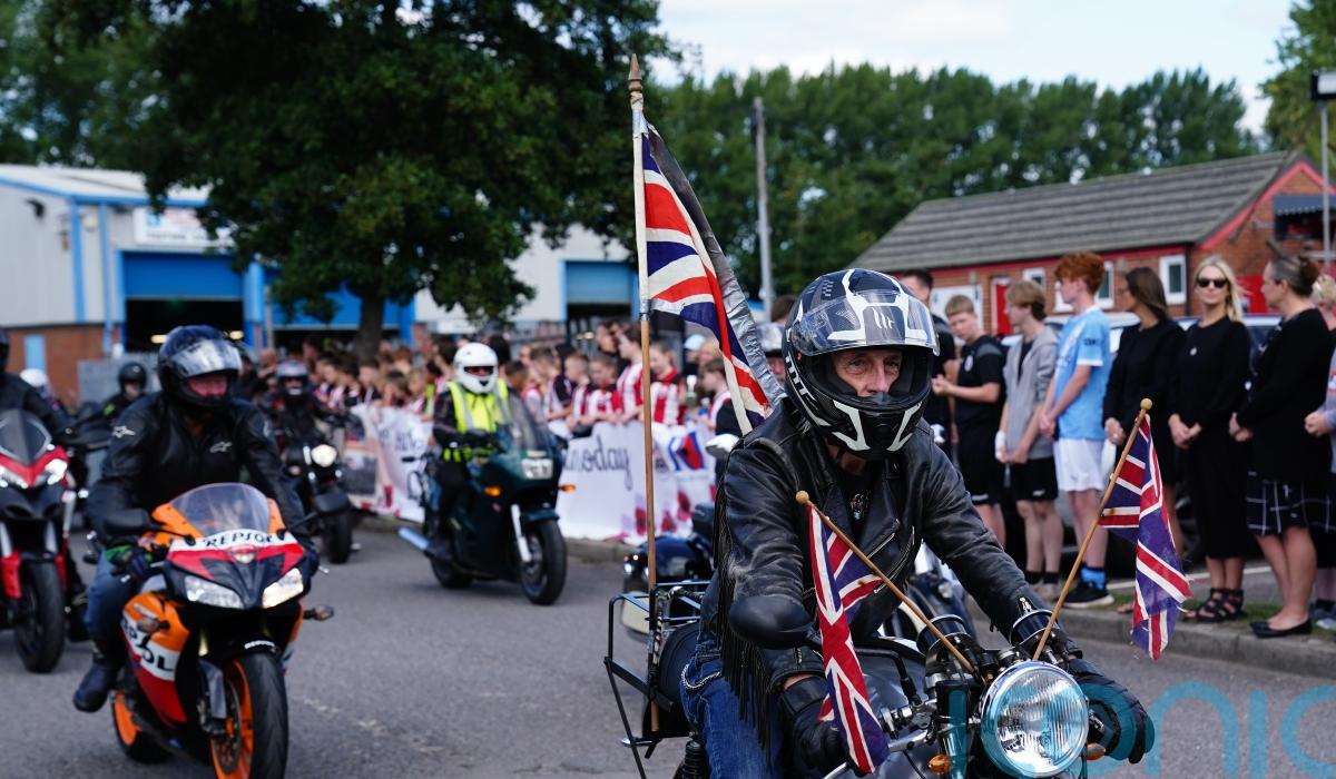 Some bikers who escorted the hearse to the service attached Union Flags and other flags reading “Lest we forget” to their motorbikes, while children outside the football ground held a banner which said: “For our tomorrow you gave your today. RIP Donald Rose.”