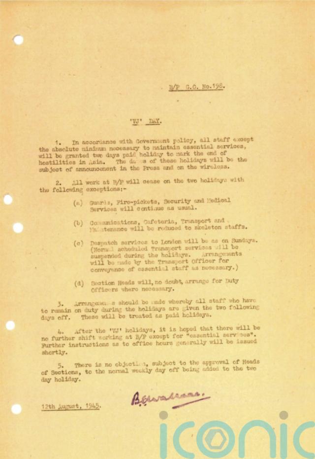 It said: “All staff except the absolute minimum necessary to maintain essential services, will be granted two days paid holidays to mark the end of hostilities in Asia.”