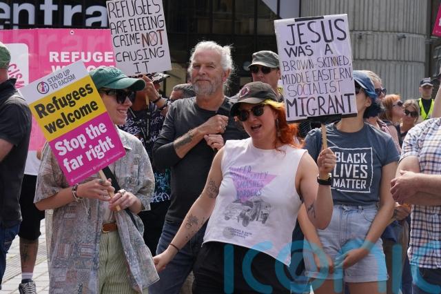 Police enforced a gap between the two groups as the anti-immigrant group chanted “Send them home” while the counter group chanted: “Refugees are welcome here.”