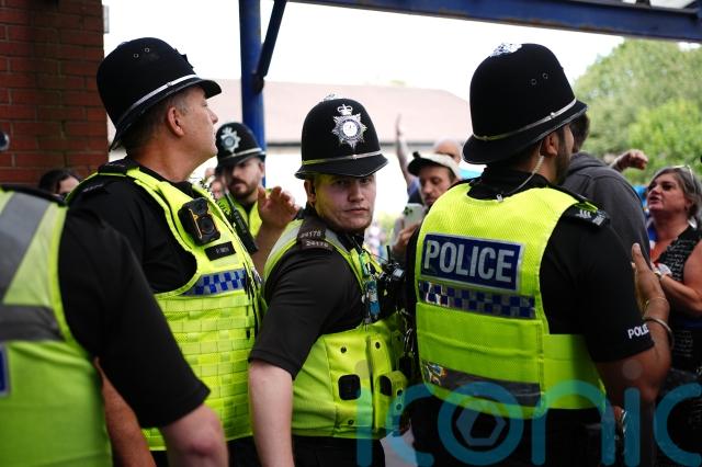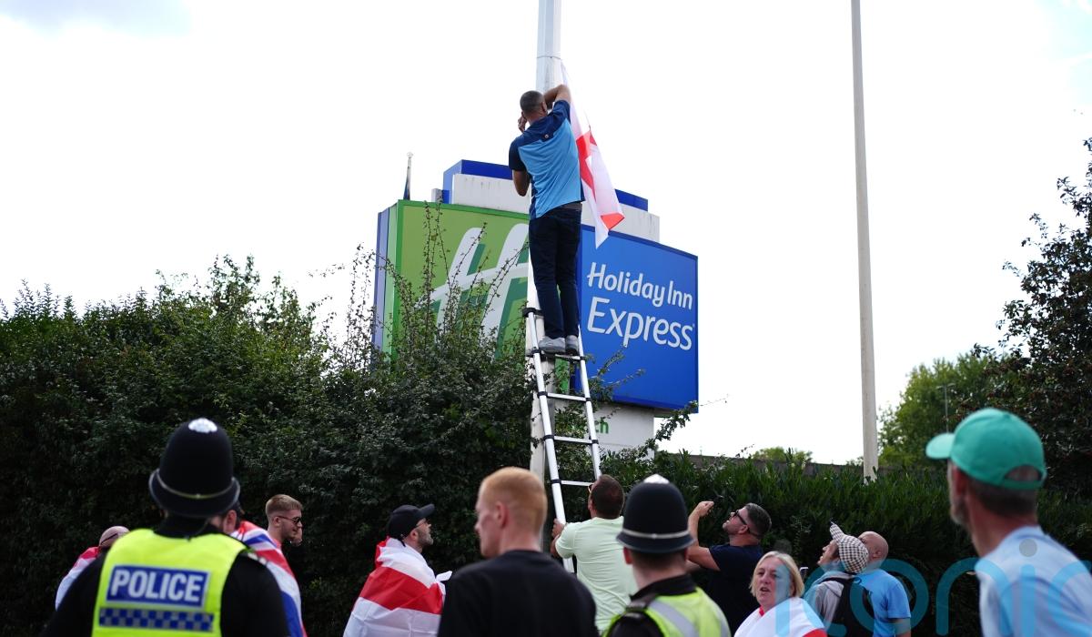 A group of protesters, some draped in the St George’s Cross, gathered outside the Castle Bromwich Holiday Inn in the West Midlands, while in London police stood guard at the Britannia Hotel in Canary Wharf.