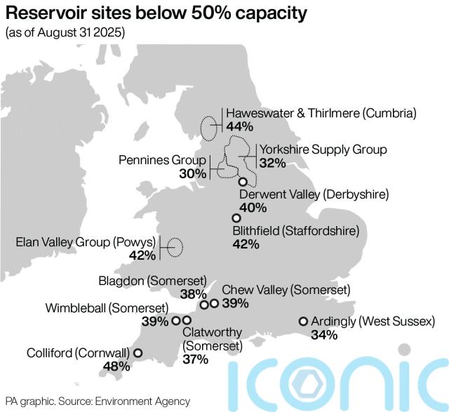 Total reservoir storage for England was 57% of the long-term average at the end of August, down from 69% at the end of July, according to the Environment Agency.