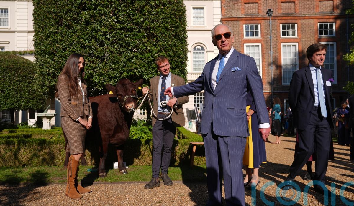 The King scratched the nose of a cow on the lawns of Clarence House during a charity reception.