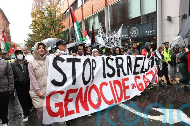 After a crowd of about 100 pro-Palestinian supporters gathered outside Manchester Cathedral to listen to speeches, they moved off en masse to march through the city centre.