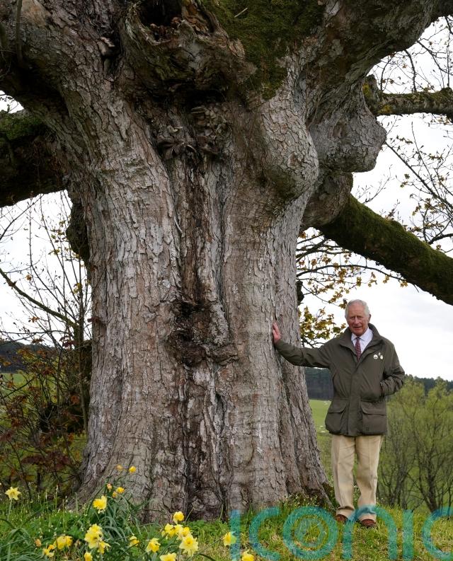 It showed Charles, in a light suit and colourful pink patterned tie, resting his hands on his shepherd’s crook walking stick, while surrounded by summer greenery in the arboretum at Highgrove Gardens, Gloucestershire, during filming.