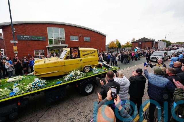 Ricky Hatton’s funeral cortege was led by the famous Reliant van from Only Fools And Horses as thousands of people lined the streets of Manchester to pay their respects to the “Hitman”.