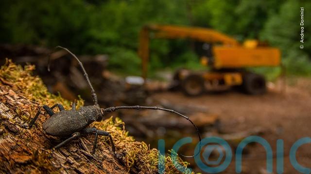 His image “after the destruction” spotlights a longhorn beetle, a key part of the ecosystem, framed by abandoned machinery in an area once logged for old beach trees.