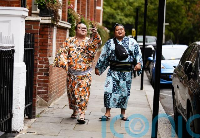 Giant sumo wrestlers have been spotted squeezing into black cabs and riding hire bikes as London hosts only the second ever professional sumo wrestling event held outside Japan.