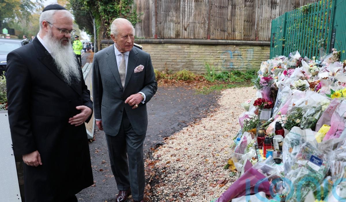 The King spent a few minutes at an outside memorial area next to the synagogue, where flowers and messages have been left by those paying their respects.