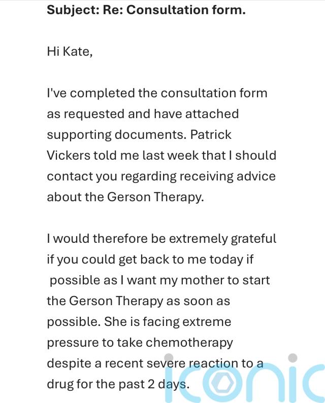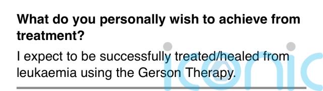 Asked what she wanted from Ms Shemirani, she wrote: “I expect to be successfully treated/healed from leukaemia using the Gerson Therapy.”
