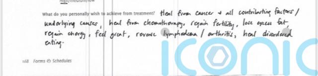Asked what she hoped the treatment would achieve, she listed “heal from cancer and all contributing factors/underlying causes” at the top of her answer.