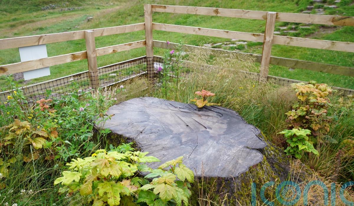 A protective cage of wire mesh netting has been added to existing fencing to prevent visitors from touching the stump, and leaving items on surrounding soil and the stump itself.