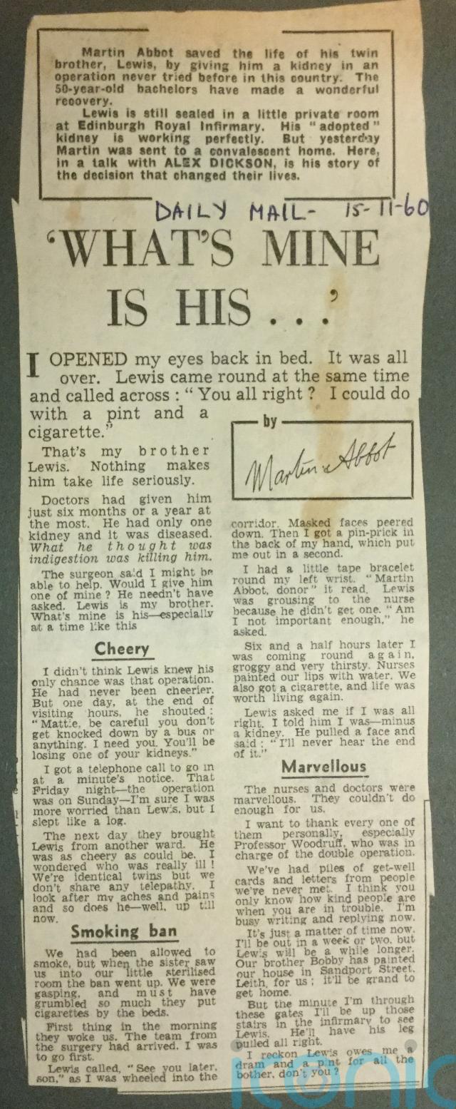 On October 30 1960, Lewis Abbott faced just six months to a year to live until he was saved by a kidney from his twin brother Martin.