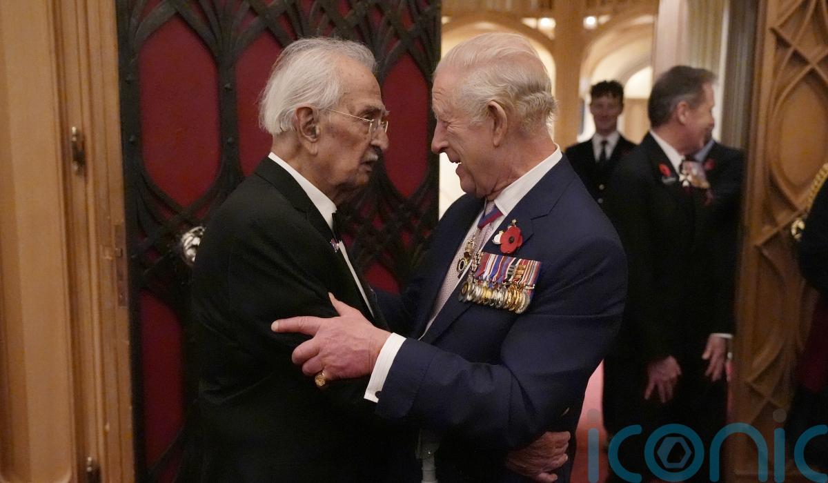 The King and a 105-year-old Second World War veteran have shared a hug during a remembrance reception at Windsor Castle.