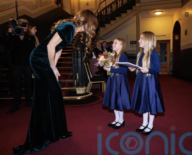 Earlier in the evening, Kate was presented with flowers by nine-year-old twins Emelia and Olivia Edwards, family of staff at Brinsworth House, a care home for entertainment industry workers supported by the Royal Variety Charity.