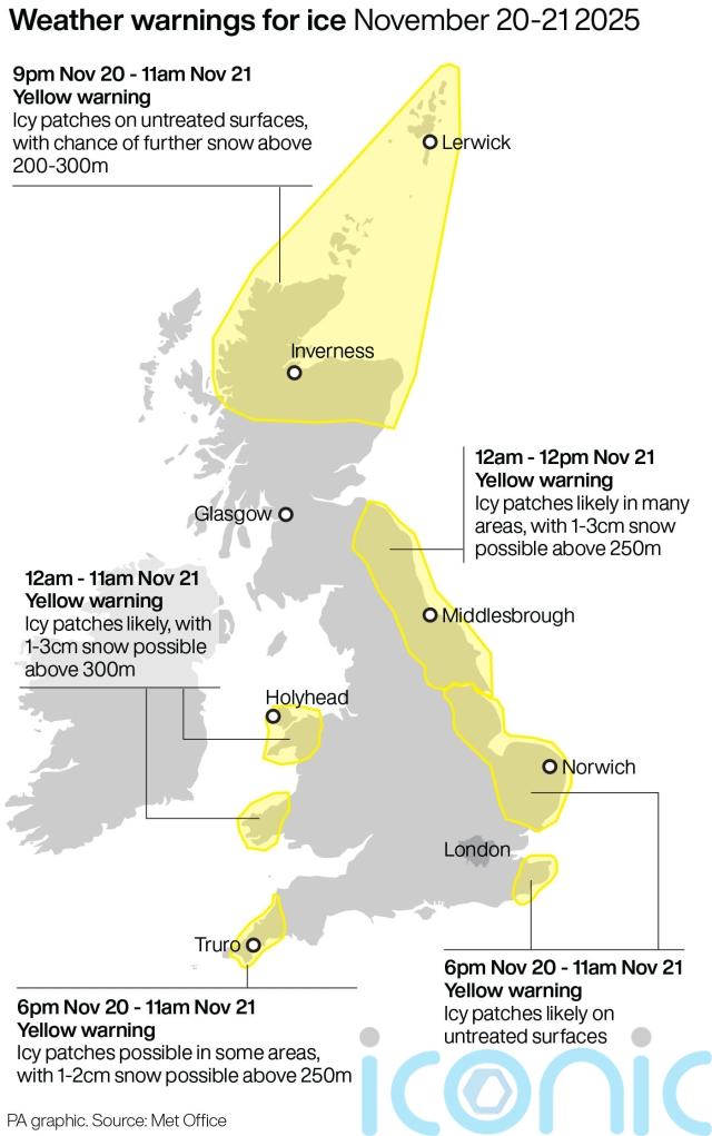 The Met Office said later Thursday will be “cold and crisp”, posting on X: “Northern Scotland and some coastal spots will see more sleet and snow showers. Elsewhere, it’s dry with sunny spells.”