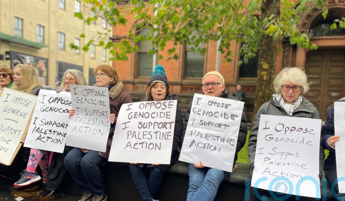 In Belfast, a crowd of about 60-80 activists and supporters gathered on a pedestrianised area close to the city’s main court buildings on Chichester Street at 1pm, with between 15-20 holding placards carrying the statement: “I oppose genocide, I support Palestine Action.”